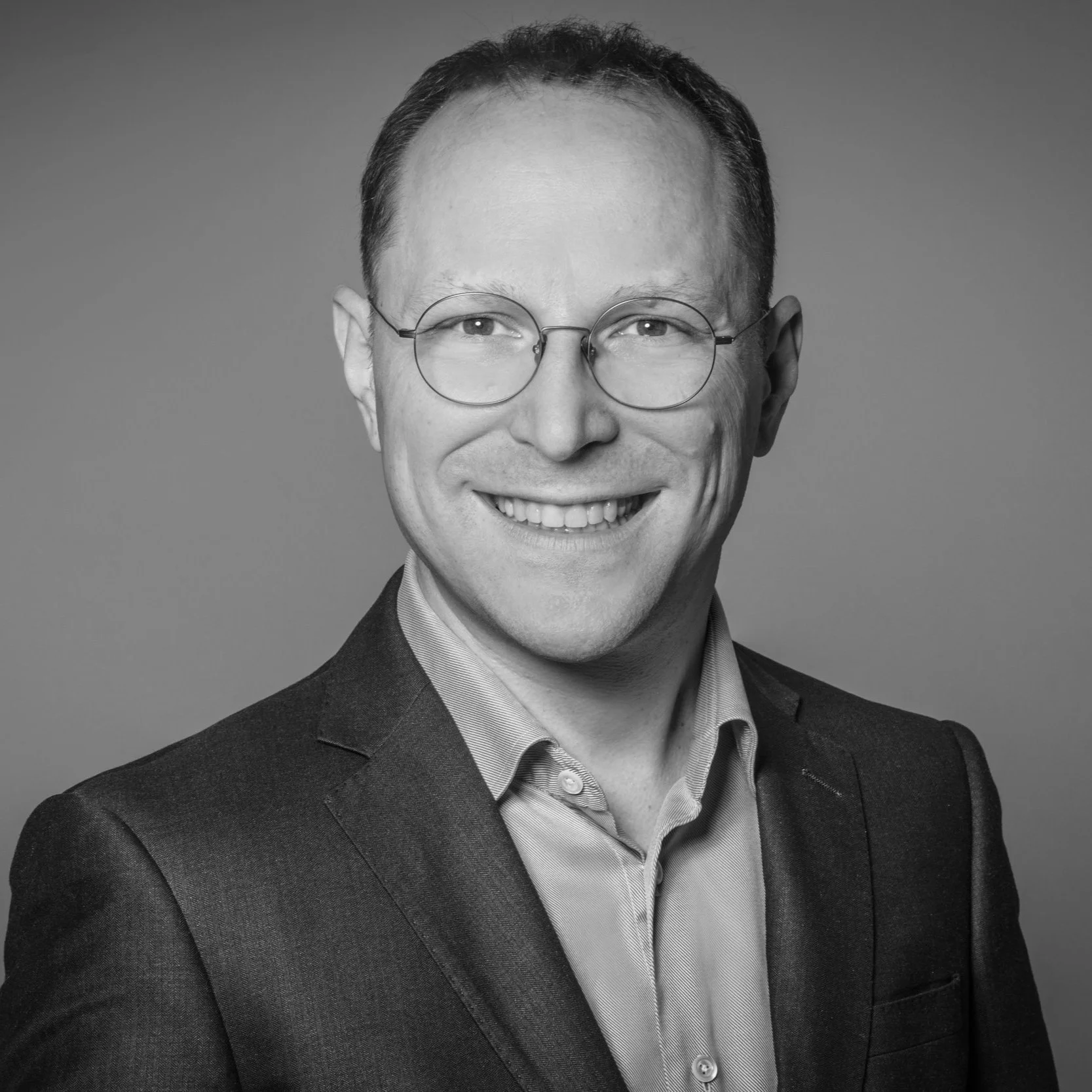 Black and white professional portrait of a smiling man wearing glasses, a collared shirt, and a suit jacket.